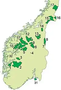 ![]() Kort over nationalparker i Syd-Norge. Denne er nr 32 på kortet | |