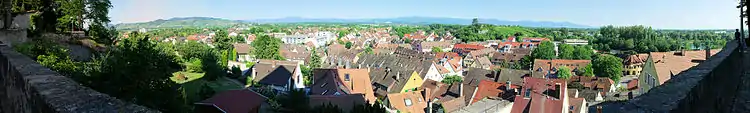 Breisach set fra domkirken. I baggrunden til venstre Kaiserstuhl og til højre udløbere af Schwarzwald