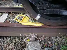 Lignende anordning bruges til at hindre biler, lastbiler og andre køretøjer i at rulle væk ved hensætning, og kaldes for en stopklods.