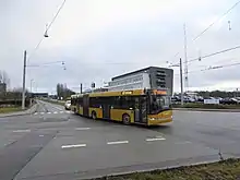 Den nu nedlagte bybus-87 svinger ud på Brendstrupgårdsvej fra Olof Palmes Allé.