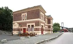 Stationsbygningen blev opført i romansk stil efter tegninger af Paul Due. Bygningen er bevaret og fredet. Den blev renoveret i slutningen af 1980'erne og bruges nu til kontor.