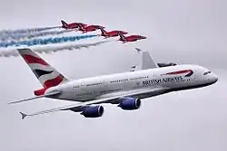 ![]() Et British Airways Airbus A380 sammen med Red Arrows.  | |||||||