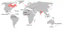 ![]() Områder der engang var en del af det Britiske Imperium. Nuværende britiske oversøiske territorier er understreget i rød.  | |||||||||||||||||||