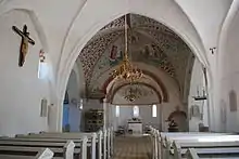 Kirkens restaurering i 1924-27 afslørede kalkmalerier fra 4 perioder; romanske fra begyndelsen af 1200-tallet, gotiske fra omkring 1500 og renæssancemalerier fra 1587. Det antages at de ældste er fra tiden kirken blev opført. Alle malerier er på kalket bund og blev renset under restaureringen i 1996-97.