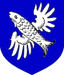 Slægten fører en hvid flyvende fisk skrå mod højre hjørne i et blåt felt og på hjelmen en lignende fisk.