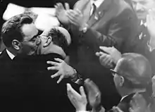 Broderkys mellem Leonid Bresjnev, generalsekretær i centralkomiteen i Sovjetunionens kommunistiske parti og Walter Ulbricht, førstesekretær i Østtyskland, som manifestation af den tætte forbindelsen mellem de to partier under partidagene i Berlin april 1967.