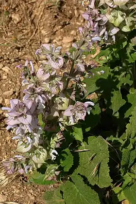 Broget salvie (Salvia sclarea) er en toårig plante med en vækst, som første år udelukkende består af en grundstillet bladroset, men andet år også af en stift opret, blomsterbærende stængel. Alle dele af planten indeholder en æterisk olie, som giver den en karakteristisk lugt, som begejstrer nogle, mens andre finder den afskyelig. Planten kaldes også muskatelsalvie eller skarlej eller skarlagen salvie