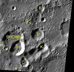 De kratere, som kaldes satellitter, er små kratere beliggende i eller nær hovedkrateret. Deres dannelse er sædvanligvis sket uafhængigt af dette, men de får samme navn som hovedkrateret med tilføjelse af et stort bogstav. På kort over Månen er det en konvention at identificere dem ved at placere dette bogstav på den side af satellitkraterets midte, som ligger nærmest hovedkrateret.[9][10][11] Brownkrateret har følgende satellitkratere: