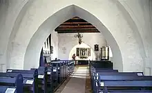 Skibet har fladt træloft, koret har fået indbygget hvælv. i sengotisk tid. Korbuen er omdannet til en spidsbue. På triumfvæggen nord for korbuen er afdækket en kalkmalet Korsfæstelse fra sengotisk tid. Altertavlen er en sengotisk fløjaltertavle, i midterskabet ses tre figurer, Nådestolen flankeres af to helgeninder, på fløjene er malerier fra 1700-tallet. Prædikestolen er fra o.1600.