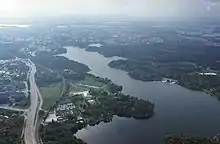 Brunnsviken, set fra helikopter mod syd og Stockholm. Bergianska trädgården ses midt i billedet, og til venstre Roslagsvägen.