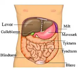 - Fordøjelseskanalen: maven, tyndtarmen, tyktarmen inkl. blindtarmen.