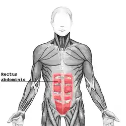 Udvendigt deles bugpartiet frontalt af en vertikal fold, linea alba som passerer navlen. På hver side ligger de store rectimuskler, hvis konturer deles af de horisontale folder, linea transversa. Hos muskuløse personer er de stærkt markerede og kaldes populært en "six-pack".