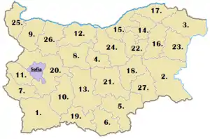 Bulgarien (bulgarsk: България, tr. Bǎlgariya), officielt Republikken Bulgarien (bulgarsk: Република България, tr. Republika Bǎlgariya, bulgarsk udtale: [rɛˈpublikɐ bɐɫˈɡarijɐ]), er et land i det sydøstlige Europa. Det grænser op til Rumænien i nord, Serbien og Makedonien i vest, Grækenland og Tyrkiet i syd og Sortehavet i øst. Indbyggertallet nåede op på 9.009.018 i 1989. Indbyggertallet faldt med 844.781 mellem folketællingerne i 2011 og 2021 til en anelse over 6,52 millioner.[7] Med et landareal på 110.772 km2 svarer det til 55-60 indbyggere per km2. Bulgarien er Europas 16.-største land. For befolkningspyramider til 2100 se under Ukraine#Eksterne henvisninger.