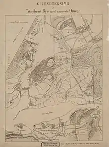 Kort fra 1865 over Tønsberg med omegn viser blandt andet kystlinjerne langs byfjorden. Kanalen gennem Stensarmen («Kanalen Stenen») mellem Tønsberg og Nøtterøy er her endnu ikke udgravet til nutidens bredde.
