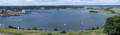 Byfjorden set fra Slottsfjellet. Agility Groups værft på Kaldnes til venstre, Ilene til højre, med Jarlsberg travbane og udløbet af Aulielva i baggrunden.