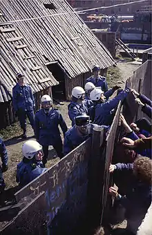 Den 24. marts 1980 mødte kommunens mandskab op for at fjerne den del af Byggeren, der stod i vejen for nybyggeriet. Imidlertid havde Nørrebros Beboeraktion arrangeret en beboerblokade foran byggelegepladsen. Dette fik borgmester Pelle Jarmer, hvis ansvarsområde bl.a. omfattede børneinstitutionen, til at miste tålmodigheden. Under et stort politiopbud blev Byggeren rykket hen på den ene halvdel af området, som tidligere bestemt. Men knap var betjentene forsvundet, før beboerne strømmede til og flyttede legeredskaber og huse tilbage. En uge senere rykkede kommunen så ind med bulldozere og ryddede hele pladsen og det kom til slagsmål og tumulter mellem politi og beboere.