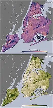 - Inden for det infrarøde strålingsfelt ændrer trækronerne den bymæssige albedo positivt (dog med en modsat rettet virkning om sommeren og vinteren) hvad angår de bladbærende planter og især nær mindre boliger[44] og mere eller mindre i forhold til stedet[45] og i overensstemmelse med bladenes livslængde.[46] De ænder på én og samme tid optagelsen af indstrålingen og lagring, henholdsvis frigivelse, af varme.