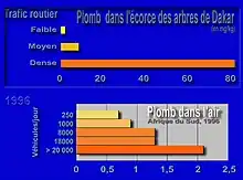 På de 50 år mellem 1950 og 2000, mens verdens befolkning er fordoblet, er antallet af biler steget endnu mere,[69] har bytræerne langs hovedgaderne været de mest udsatte for blyforureningen (som siden er mindsket efter overgangen til blyfri benzin) og en betydelig forurening med luftbårne partikler. Denne forurening er en er en notorisk årsag til dårligt helbred, og man har fastlagt grænseværdier i mange lande.[70] Takket være deres løvmasse, som fylder et stort rumfang (en stor, færdigt udviklet overflade) mere eller mindre i forhold til de fysiske og biologiske egenskaber ved bladoverflader, træstruktur, og først og fremmest deres kronebygningset kan træerne fungere som:[71]