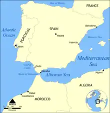 Cádizbugtens beliggenhed i forhold til de omkringliggende lande og have.