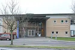 Hovedindgangen til CELF på Kringelborg Allé i Nykøbing Falster.