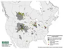 Efter at sygdommen første gang blev påvist hos hjorte i fangenskab i 1967, blev den i 1981 påvist hos vilde dyr og er nu udbredt i Nordamerika. Sygdommen er også påvist i Sydkorea hos nordamerikanske kronhjorte importeret fra Canada.