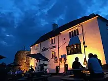 Hanbury Arms med tårnet fra Caerleon Castle i baggrunden.