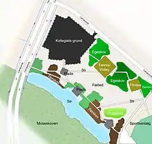 Sydøst for kollegiet etableres en park til bygningens beboere. Her vil man kunne finde terrasser og siddetrapper langs den eksisterende sø. Søen udvides og kommer til at fungere som et regnvandsbassin for regnvand fra park og bygning. Langs med søen plantes der rørskov og ellebevoksning. I kollegiets park vil der være mulighed for at dyrke sport på tennis-/volley-banen og fitness-området. Terrasser, sportsområder og pladserne forbindes med diagonale stisystemer, der skaber forbindelse til den omgivende by og universitetet. Campus Kollegiets park forventes at være færdig i løbet af sommeren 2016[4]