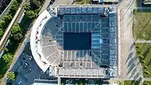 Luftfoto af Court central på Stade IGA i Montréal. Den buede tribune er resterne af baseballarenaen Stade Parc Jarry, der var hjemmebane for Montreal Expos i 1969-76.
