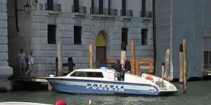 Stort set al trafik foregår på kanalerne. Her ses en af politiets både på Canal Grande, 2012.