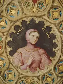 Hvad Laura angår, har man udpeget Laura de Sade med pigenavnet Laura de Noves (født 1310 i Avignon, død 6. april 1348), gift med grev Hugues 2. de Sade.[6] Det kan dog ikke siges med sikkerhed.[7] Denne Laura var sytten år og allerede gift, da Petrarca første gang så hende i 1327, og hun fik elleve børn med sin mand. Ligesom Dantes Beatrice blev hun alligevel et symbol på platonisk kærlighed. Men mens Dante anbragte sin Beatrice i himmelen, lod Petrarca Laura - beskrevet som en engel - føre det guddommelige ned på jorden:.