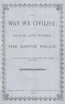 - Feilberg, Carl Adolph (anonymous): The Way We Civilise; Black and White; The Native Police: – A series of articles and letters Reprinted from the ‘Queenslander’ (Brisbane, December 1880).