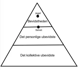 Selvet er Jungs betegnelse for den totale pykes centrum. Det er altså centrum for både bevidstheden og det ubevidste. Jung beskriver således selvet som et punkt midt imellem bevidstheden og det ubevidste.[23] Det er det ”dybere jeg” – det jeg, der repræsenterer den totale psyke. Se figur 2.