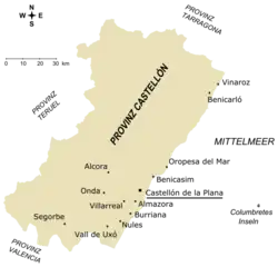 Andre store byer i provinsen er Villarreal, Burriana, la Vall d'Uixó og Vinaròs. Der er 135 kommuner i provinsen, som dækker et område på 6.632 km².