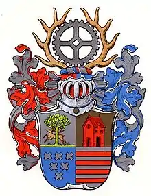 På hjelmen er der et sort urværkshjul mellem to hjortevier.