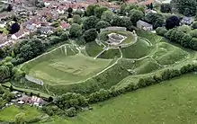 På toppen af motten var der et beboelsestårn, og på baileyen nedenfor var der flere servicebygninger, lagerfaciliteter og værksteder. Der blev anlagt en ringmur omkring hele motten, og til en vis grad også omkring baileyen.