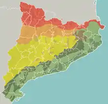 ![]() Cataloniens placering (mørkegrøn) – på det europæiske kontinent (grøn og mørkegrå) | |