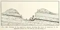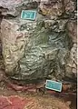 Et tværsnit af Pipestone Quarry i Minnesota der viser laget af catlinit (rød pibesten) mellem lag af sioux-kvarts