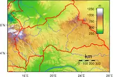 Det laveste punkt er Oubanguifloden, 335 meter over havet, og det højeste Mont Ngaoui ved grænsen til Kamerun, 1.420 meter over havet.