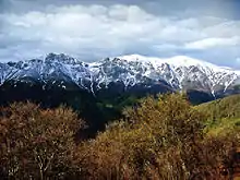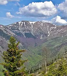 ![]() Udsigt fra Ray vilohus mod de Centrale Balkanbjerge. Vandfaldet Raysko Praskalo ligger i midten | |