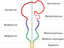 ![]() Diagram der viser hovedopdelingerne af den embryoniske vertebrahjerne. | |