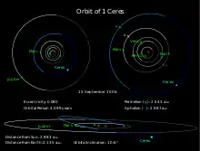 Ceres blev opdaget den 1. januar 1801 og blev i starten opfattet som en fuldgyldig planet. I løbet af de efterfølgende år blev der opdaget et stort antal andre himmellegemer i samme område som Ceres, og efterhånden opgav man tanken om, at Ceres var en rigtig planet. I stedet blev den lidt forvirrende betegnelse "asteroide" indført for disse nye objekter. Ceres roterer en gang rundt om sin egen akse på ni timer, og det tager 4,6 år for Ceres at fuldføre et omløb omkring Solen. Ceres bane befinder sig mellem 2,6 og 3 AU fra Solen