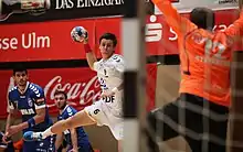 En spiller fra Chambéry Savoie HB skyder mod mål