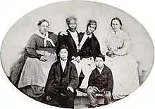 Familiebillede fra 1860'erne af Chang og Eng Bunker med deres koner og 18 af deres børn. Fotoet inkluderer også Grace Gates, en af deres 33 slaver i plantagen.
