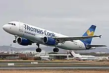 Et dansk indregistreret charterfly fra Thomas Cook Airlines Scandinavia letter fra Faro Airport ved Algarvekysten i Portugal.