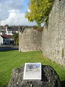 En del af Port Wall, Chepstow, med en informationstavle Chepstow Society