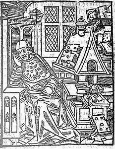 ![]() Tryk der forestiller Chrétien de Troyes i hans arbejdsværelse (1530) | |
