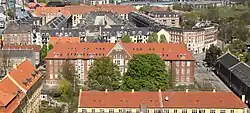 ![]() Christianshavn Skole set fra toppen af Vor Frelsers Kirke (København). | |