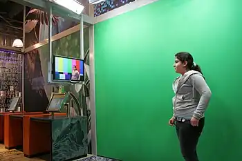 Eksempel på anvendelse af Chroma key, hvor en deltager optræder foran et grønt lærred mens det endelige resultat efter sammenkopiering af flere digitale lag vises på skærmen.