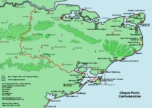 Sammenslutningen (konføderationen) Cinque Ports opstod tidligt i middelalderen, og omfatter én havn i det østlige Sussex (Hastings) og fire havne i Kent (New Romney, Hythe, Dover og Sandwich). Desuden er to byer i det østlige Sussex (Rye og Winchelsea) knyttet til Cinque Ports. I perioder har andre byer også været knyttet til sammenslutningen.