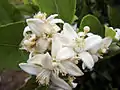 Det lille træ bliver 3-6 meter højt, har kraftige torne men smukke, store blomster med hvide kronblade, der er lyserøde på ydersiden. Træet blomstrer året rundt og står derfor med blomster og modne frugter på en gang. Frugterne er gule og ægformede med en tyk, læderagtig skræl.